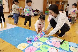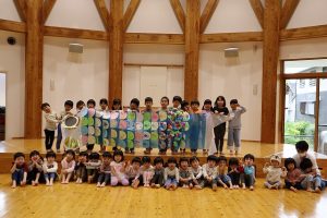 今年のお楽しみは、各クラスそれぞれうろこに装飾をして、みんなで大きいこいのぼりを作りました!