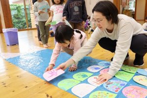 今年のお楽しみは、各クラスそれぞれうろこに装飾をして、みんなで大きいこいのぼりを作りました!