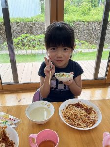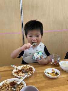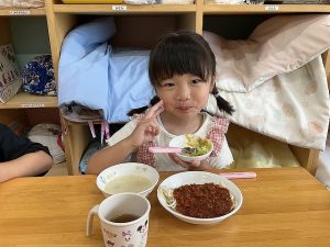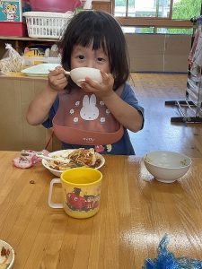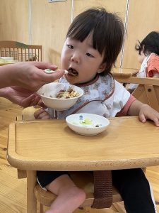 担任の先生から、「食べることが大好きでなんでもよく食べてます。保育園にも慣れて笑顔で過ごせるようになりました。」と紹介してもらいました。