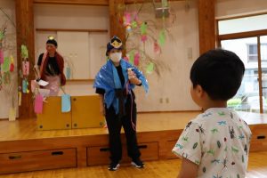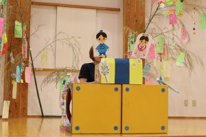まずは、担当保育者から七夕の由来について、ペープサートで分かりやすく教えてもらいました。