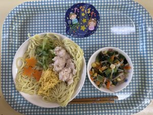 七夕のお楽しみメニューは、【冷やし中華・ツナ和え・七夕ゼリー】でした🍴