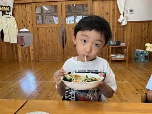 大きくカットされたメロンに大興奮の子ども達!早く食べたくてうどんや唐揚げをペロリとたいらげていました😋