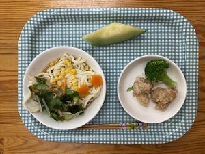 献立「サラダうどん、鶏の塩唐揚げ、添え野菜、果物」でした。