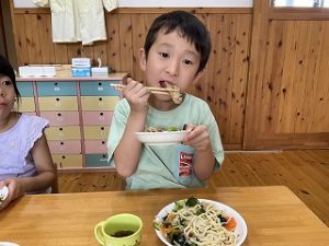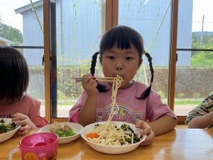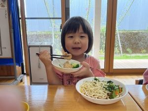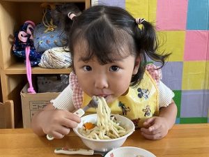 大きくカットされたメロンに大興奮の子ども達!早く食べたくてうどんや唐揚げをペロリとたいらげていました😋