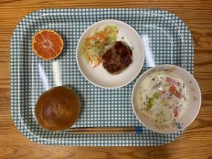 セルフのハンバーガー、添え野菜、コーンクリームスープ、花みかん