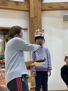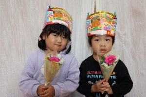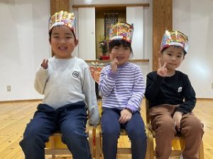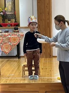 つき組さんはお家の方もお祝いに来てくださり、お遊戯場で副園長とお参り、園長からのお話といつもの流れで始まりました。